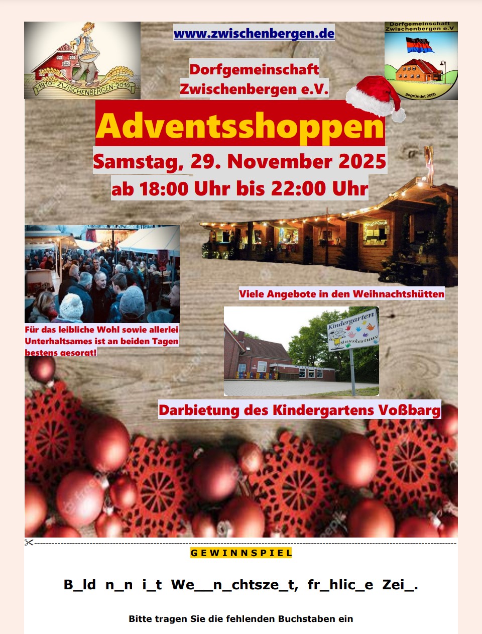 Genießt die fröhliche und gemütliche Weihnachtsatmosphäre und kommt am 29.11. von 18.00 -22.00 Uhr und am 30.11. ab 14.00 Uhr zu uns auf den Dorfplatz in Zwischenbergen.